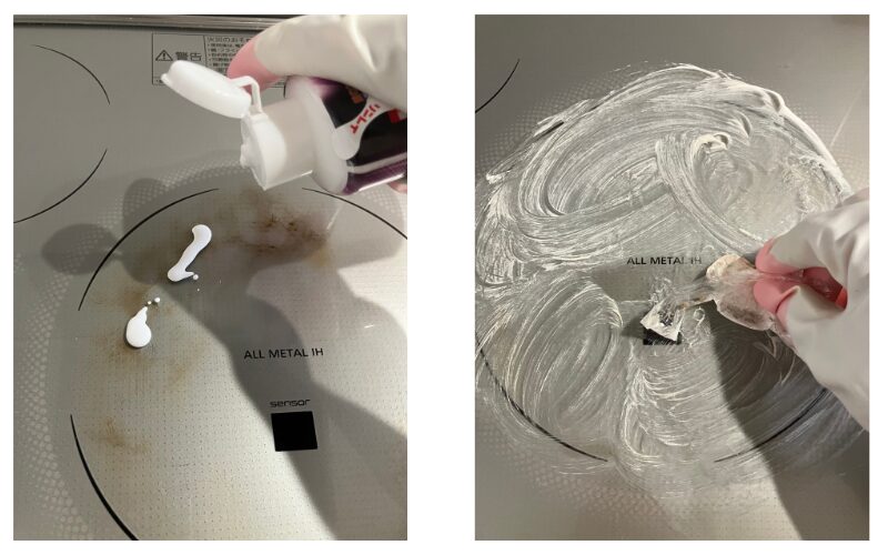 ①焦げ付き部分にウルトラハードクリーナーを垂らし、丸めたラップで擦る。